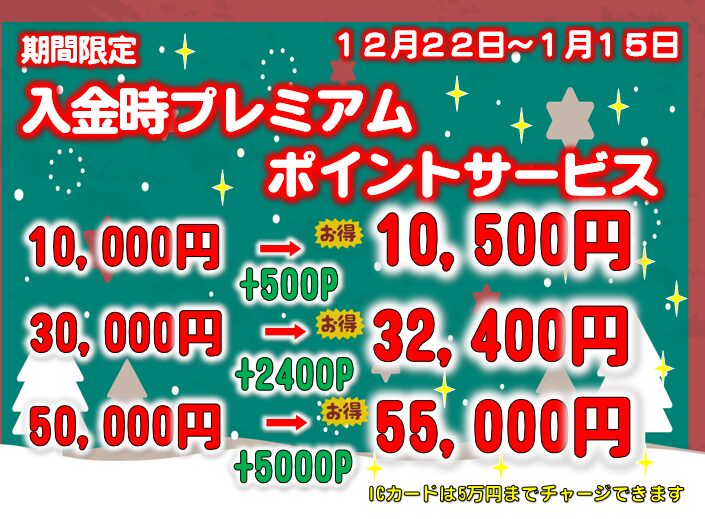 令和7年12月22日~令和8年1月15日まで入金時プレミアムポイント付与キャンペーン実施🎉